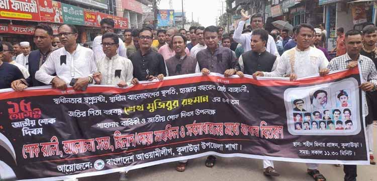 বিশেষ প্রতিনিধি: জাতির জনক বঙ্গবন্ধু শেখ মুজিবুর রহমানের ৪৭তম শাহাদাত বার্ষিকী ও জাতীয় শোক দিবস কুলাউড়া উপজেলা প্রশাসন ও উপজেলা আওয়ামী লীগের উদ্যোগে যথাযোগ্য মর্যাদায় পালন করা হয়েছে। কর্মসূচির মধ্যে ছিল জাতীয় পতাকা অর্ধনমিত ও কালো পতাকা উত্তোলন, বঙ্গবন্ধুর প্রতিকৃতিতে পুস্পস্তবক অর্পণ, শোকর্যালী, আলোচনা সভা ও মিলাদ মাহফিল।