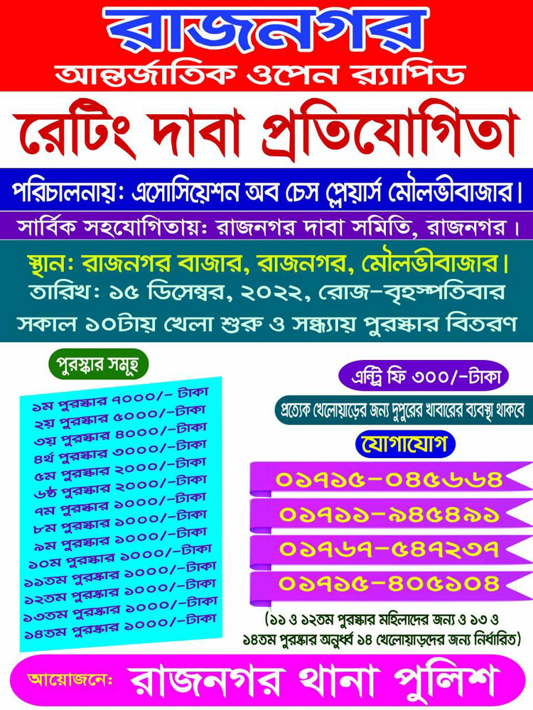 রাজনগর দাবা সমিতির সার্বিক সহযোগিতায় অনুষ্টিতব্য আন্তর্জাতিক র্যাপিড রেটিং দাবা প্রতিযোগিতায় ১ম পুরস্কার: ৭,০০০/-টাকা, ২য় পুরস্কার: ৫,০০০/-টাকা, ৩য় পুরস্কার: ৪,০০০/-টাকা, ৪র্থ পুরস্কার: ৩,০০০/-টাকা, ৫ম পুরস্কার: ২,০০০/-টাকা, ৬ষ্ট পুরস্কার: ২,০০০/-টাকা, ৭ম পুরস্কার: ১০০০/-টাকা, ৮ম পুরস্কার: ১০০০/-টাকা, ৯ম পুরস্কার: ১০০০/-টাকা, ১০ম পুরস্কার: ১০০০/-টাকা। ১১তম পুরস্কার: ১০০০/-টাকা, ১২তম পুরস্কার: ১০০০/-টাকা। ১৩তম পুরস্কার: ১০০০/-টাকা। ১৪তম পুরস্কার: ১০০০/-টাকা।