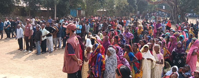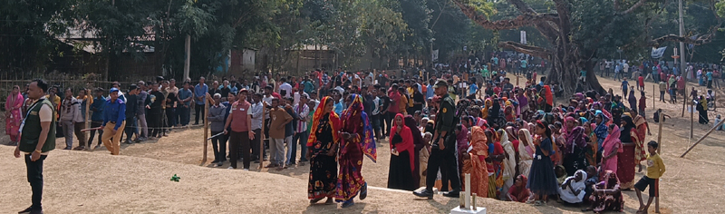 মৌলভীবাজার-২ কুলাউড়া আসনের ১০৩ ভোটকেন্দ্রে শান্তিপূর্ণ পরিবেশে ভোটগ্রহণ শান্তিপূর্ণভাবে শেষ হয়েছে। সকাল থেকেই উপজেলার চা-বাগান কেন্দ্র ছাড়াও বিভিন্ন ভোটকেন্দ্রগুলোতে নারী ভোটারদের দীর্ঘ লাইন লক্ষ্য করা গেছে। বৃহস্পতিবার সকাল আটটা থেকে দুপুর দেড়টা পর্যন্ত বিভিন্ন কেন্দ্র ঘুরে দেখা যায়, নারী ভোটারদের উপস্থিতি ছিল চোখে পড়ার মতো। পুরুষ ভোটারের উপস্থিতি খুবই কম। কিন্তু বেলা ১১টার দিকে উপজেলার সবক’টি চা-বাগান কেন্দ্রে নারী-পুরুষ ভোটারদের উপস্থিতি অনেক বেশি বেড়েছে। উপজেলার গাজীপুর চা-বাগান প্রাথমিক বিদ্যালয়, রাঙ্গিছড়া সরকারী প্রাথমিক বিদ্যালয়, নলডরী সরকারি প্রাথমিক বিদ্যালয়, কর্মধা ইউনিয়ন বাজার দাখিল মাদ্রাসা ও কর্মধা উচ্চ বিদ্যালয় কেন্দ্র ঘুরে দেখা যায়, সকাল ৯টা থেকেই এসব কেন্দ্রে নারী ভোটারদের ভিড় বেশি দেখা যায়। বিশেষ করে গাজীপুর চা-বাগান, রাঙ্গিছড়া চা-বাগান ও নলডরী সরকারি প্রাথমিক বিদ্যালয় কেন্দ্রে নারী-পুরুষ ভোটারদের লাইন অনেক দীর্ঘ। অনেক ভোটার লাইনে দাঁড়িয়ে ধৈর্য সহকারে ভোট দেওয়ার অপেক্ষা করেন। এছাড়া ক্ষদ্র নৃ-তাত্বিক জনগোষ্ঠীর নাগরিকরাও তাদের স্ব স্ব ভোট কেন্দ্রে সারিবদ্ধভাবে লাইনে দাঁড়িয়ে ভোট দিতে দেখা গেছে। তারা জানান, এবার তারা অনেক উৎসাহ-উদ্দীপনার মধ্যে দিয়ে ভোটাধিকার প্রয়োগ করছে। যেহেতু আওয়ামীলীগ এবারের নির্বাচনে বাইরে রয়েছে তাই দেশের উন্নয়নে বিশেষ করে চা-বাগানের লোকদের দাবি-দাওয়া পূরণে যে দল সরকার গঠন করবে সেই দলের প্রতিনিধিকে চা-শ্রমিকরা ভোট দিবে। এদিকে বিভিন্ন ভোট কেন্দ্র পরিদর্শন করে তদারকি করছেন মৌলভীবাজারের স্থানীয় সরকার বিভাগের উপ-পরিচালক মো: রুবেল আহমদ, সহকারী রিটার্নিং কর্মকর্তা মো.