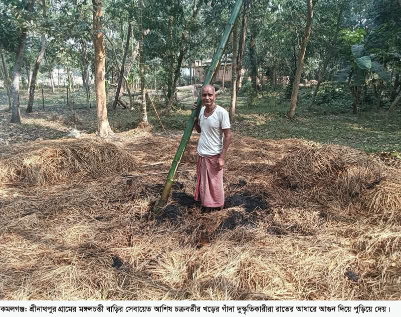 কমলগঞ্জ উপজেলার ১নং রহিমপুর ইউনিয়নের শ্রীনাথপুর গ্রামের ঐতিহ্যবাহী মুন্সিবাড়ী সংলগ্ন শ্রী শ্রী মঙ্গলচন্ডী বাড়ির সেবায়েত আশিষ চক্রবর্তীর খড়ের গাঁদা দুস্কৃতিকারীরা রাতের আধারে আগুন দিয়ে পুড়িয়ে দিয়েছে। ১৪ ফেব্রুয়ারি শনিবার রাত আনুমানিক ১০ ঘটিকার সময় এ ঘটনাটি ঘটে। এ নাক্কারজনক ঘটনায় আতংক বিরাজ করছে। খবর পেয়ে কমলগঞ্জ থানা পুলিশ ঘটনাস্থল পরিদর্শন করেছে।