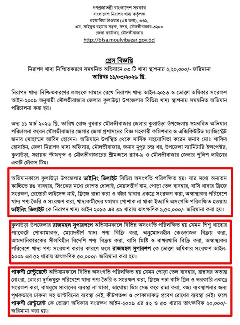কুলাউড়ায় অস্বাস্থ্যকর পরিবেশে খাবার প্রস্তুত ও বিক্রির অভিযোগে তিনটি প্রতিষ্ঠানকে মোট ২ লাখ ২০ হাজার টাকা জরিমানা করেছে ভ্রাম্যমাণ আদালত। ১১ মার্চ বুধবার দুপুরে পৌর শহরের বিভিন্ন এলাকায় জেলা প্রশাসনের উদ্যোগে পরিচালিত ভ্রাম্যমাণ আদালতে এ জরিমানা করেন জেলা প্রশাসক কার্যালয়ের সহকারী কমিশনার ও নির্বাহী ম্যাজিস্ট্রেট মো. আবিদ হোসেন। অভিযানে ডাইনিং ডিলাইট নামক রেস্টুরেন্টে কাচ্চিতে রঙ ব্যবহার, সিংকের মধ্যে গোশত ধোয়া, মেয়াদোত্তীর্ণ বান সংরক্ষণ, পোড়া তেল ব্যবহার এবং প্রতিষ্ঠানটির কোনো রেস্তোরাঁ লাইসেন্স না থাকায় ১ লাখ ৫০ হাজার টাকা জরিমানা করা হয়। এদিকে পাকশী নামক রেস্টুরেন্টে নোংরা ও দুর্গন্ধযুক্ত রান্নাঘর, ফ্রিজে পচা গ্রিল ও তরকারি সংরক্ষণ, মাছি-পোকামাকড়ের উপদ্রব, পোড়া তেল ব্যবহার, বাথরুমে সাবানের ব্যবস্থা না থাকা এবং আধোয়া ডিম সেদ্ধ করে রান্নার অভিযোগে ২০ হাজার টাকা জরিমানা করা হয়। অপরদিকে রাজমহল নামক প্রতিষ্ঠানে শিশুখাদ্যের প্যাকেটে পোকামাকড়, মেয়াদোত্তীর্ণ পণ্য, অনুমোদনহীন কেওড়াজল বিক্রি, আমদানিকারকের সীলবিহীন বিদেশি পণ্য এবং বাসি মিষ্টি ও বাখরখানি বিক্রির অভিযোগে ৫০ হাজার টাকা জরিমানা করা হয়।